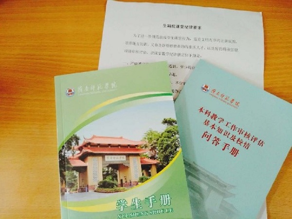 最后,我们要求每一位同学都认真阅读《本科教学工作审核评估基本知识及校情问答手册》以及《学生手册》,请每个宿舍的舍长做好监督与记录工作。