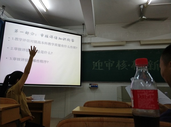 会议伊始,大家一起参与了“我校本科教学工作审核评估基本知识及校情”相关知识的有奖问答环节,同学们积极参与,现场气氛十分融洽,从同学们回答问题的积极性可以看出大家对本次会议的态度是非常重视的,15生物技术班迎接审核评估的精神是可嘉的。