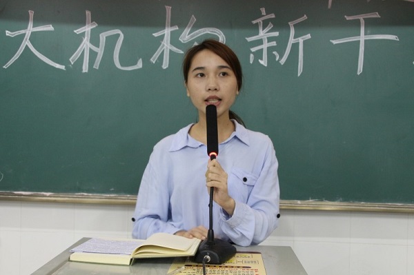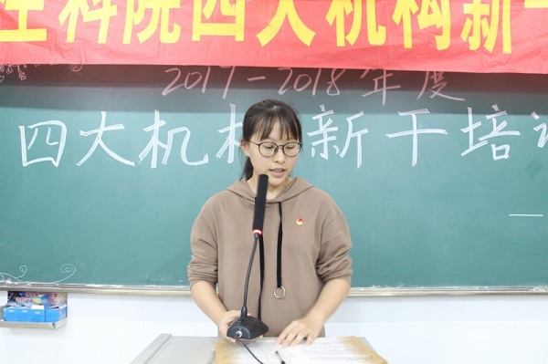 会议伊始,全体人员观看了一段充满激情而又温暖感人的视频,新干们从视频中了解了四大机构的主要部门及其工作职责和部门风采。接着,学生干部代表郭欢和李凤钰先后发言。郭欢从工作和学习两方面分享了她的干部心得。在工作方面,她希望新干们能做到五点,分别是懂礼貌、勤思考、保持“五心”、常感恩、勿忘初心;在学习方面,她提醒同学们要使工作与学习平衡发展,同时,她与同学们分享了自己的学习技巧。李凤钰则分享了生活方面的心得。她认为保持良好的精神面貌和人际关系,同时坚持自身兴趣爱好的人会更有幸福感。最后,她希望新干们在未来的大学生活中做一个有理想、有抱负的人并过得开心、满足、踏实。