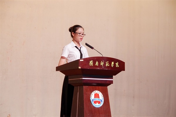 2017级生本2班何家谊同学作为新生代表发言。她谈到,初到岭师就感受到师兄师姐的热情与温暖,感谢师兄师姐在暑期时就开始为他们无微不至地打点生活。在逐梦路上,她分享了以下几点经验与同学们共勉:脚踏实地,活到当下;事前三思,事后三省;砥砺前行,塑造真我。