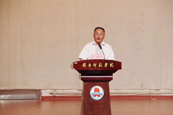 首先,院长陈道海教授发表讲话。他表示,生科院2017级新同学共有438人,他们来自五湖四海,却因共同选择了岭师而走在一起。在校园文化建设中,生科院多年来举办的三大特色活动成效显著,获得了学校“学风建设先进单位”。2015年以来,生科院获得众多荣誉,先后被学校评为“就业先进单位”和“考研先进单位”。此外,陈院长为同学们详细介绍了生科院5大专业的基本情况和就业信息,特别介绍了今年新增专业——海洋资源开发技术。他相信,新生进入大学生活以后会学到很多东西,并做到独立、自主,学会学习、规划人生。