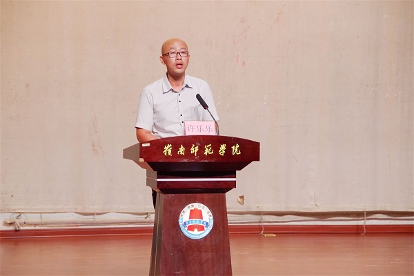 教师代表2017级生物技术班班主任许乐乐博士本着既惶恐又兴奋的心情,向新生分享了他从过去平稳的生活到通过实践探索知识改变了人生轨迹的亲身体验,希望和新同学在生科院能够一起愉快地学习、生活。