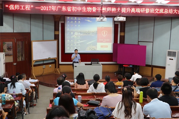 最后,生科院刘锴栋副院长做总结发言。刘院长从研修班的筹划、调研、开展、后勤保障等方面总结了2017年广东省初中生物骨干教师能力提升高端研修班的活动。他表示研修班项目工作组克服重重困难给学员提供了最优质的服务,聘请了最权威、最专业、最实用的专家团队给学员们上课,同时讲述了本次研修班培训台前幕后的故事。最后,他对对学员们接着的跟岗学习提出了要求与期望,他希望全体学员努力学习、勤于思考、善于总结、再接再厉,加速由骨干教师向名师转变,共同推进广东省生物课堂的教学改革。