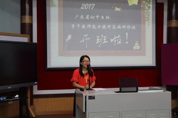 最后,学员代表顺德北滘君兰中学傅红霞老师发言。她首先衷心感谢岭南师范学院和生科院对此次培训的精心、贴心的服务和周到安排,她也对培训班的学习充满了期待,代表全体学员承诺带着责任认真学习,全面提升自己的能力。