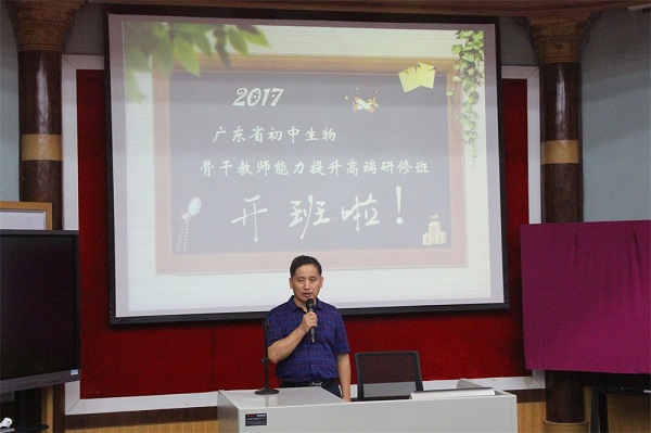 【生科院新闻中心8月28日讯】8月27日早上九点, 2017广东省初中生物骨干教师能力提升高端研修班在岭南师范学院榕楼一楼培训室隆重举行。岭南师范学院培训学院院长许占权教授、生命科学与技术学院党委书记袁长春教授、院长陈道海教授、郑候锦副书记、副院长刘锴栋副教授以及负责本次培训班的相关老师和全体学员参加了本次开班典礼。开班典礼由本项目负责人刘锴栋老师主持。