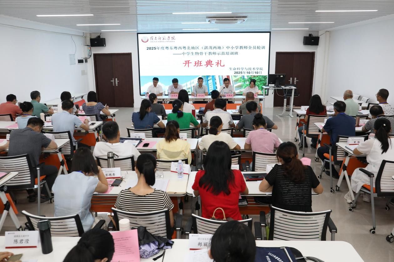 10月10日,2025年度粤东粤西粤北地区(湛茂两地)中小学教师全员轮训——中学生物骨干教师示范培训开班仪式在岭南师范学院第五教学楼A栋612隆重举行。生科院党委书记李发武、院长刘锴栋、副院长孙余丹、教师余小杏、教师梁光明出席开班仪式,开班仪式由刘锴栋院长主持。来自湛江、茂名电白区两地各学校的51名生物骨干教师齐聚一堂,共同参加此次仪式。