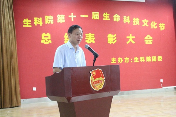 生科院党委书记袁长春发表了热情洋溢的讲话。他首先祝贺了获奖的团体和个人。他表示,生命科技文化节已经走过了十一年,如今已成为生科院学生活动实践育人的品牌项目,生命科技文化节得到全院师生的共同参与,已成为展示生科院最大的平台与载体。生命科技文化节结合专业的特点,将实践育人、学生能力的培养融入进来,与校内其它学院的文化节相比,生命科技文化节优势明显。虽然本届生命科技文化节即将落幕,但这并不意味着其所倡导的理念和精神到此终止。袁长春指出,生科院举办生命科技文化节的目的和宗旨是希望同学们能够热爱生命,钻研生命科技,真正地引领生物科学。他认为,生命科技文化节贯穿生科学子的学习生活,而举行总结表彰大会,不仅是为了表彰优秀,而且是为了承上启下。通过这样一个大型的活动和平台,能够把生科院学生实践能力的培养、应用型人才的培养真正地突显出来。他感谢各专业指导老师对学生的悉心指导,感谢为生命科技文化节付出辛勤劳动的老师和同学。最后,他希望第十二届生命科技文化节能够尽快着手准备,并希望生命科技文化节能够上水平、上台阶、影响不断扩大,真正成为学校品牌、甚至是广东省高校乃至全国的科技文化节的品牌。