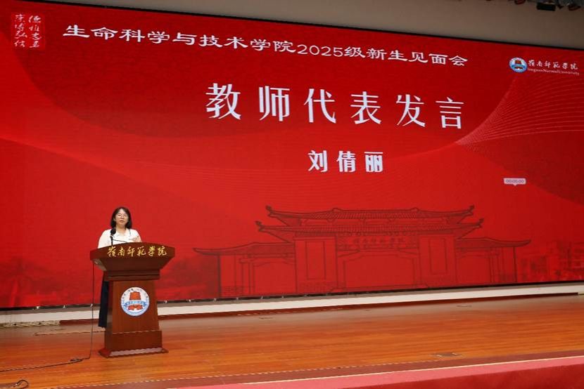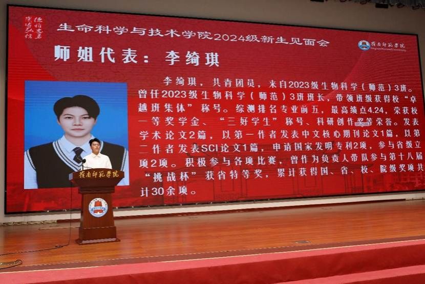 2023级生物科学3班的李绮琪同学作为学姐代表,在新生见面会上分享了自己在生科院的成长历程,强调生科院是一个充满温暖与可能的平台,鼓励新生主动融入、勇于尝试、坚持探索,在师长的指导与同窗的陪伴下书写属于自己的精彩篇章。
