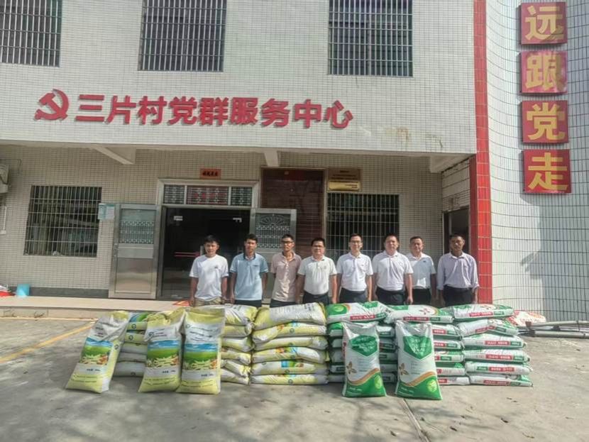 在三片村党群服务中心前,岭师生科院农村科技特派员团队联合捐赠的一批农用物资整齐堆放,包括复合肥、微量元素肥等。这批物资将由乾塘镇三片经济联合社统筹分配,精准投放至受灾严重的农田,为农户尽快恢复生产提供有力支持。三片经济联合社代表激动地说:“这些物资来得太及时了,真是解了我们的燃眉之急!”