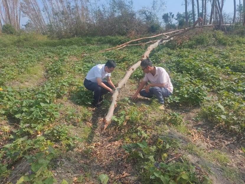 座谈会后,特派员团队立即深入田间地头,实地查看作物受损情况。在番薯种植区,一棵被台风刮倒的桉树压损了部分薯苗,陈胜勇蹲在田垄间,拨开叶片仔细查看薯苗根系:“要尽快清理植株残体,做好排水防涝,同时喷施叶面肥增强作物抗逆性……”他一边观察,一边讲解灾后病虫害防治与田间管理要点。