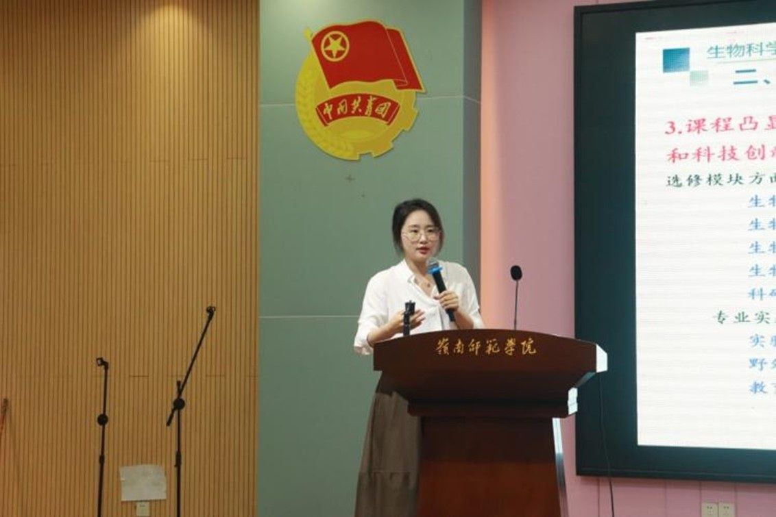 教师代表谢鹏博士向新生们介绍了生物科学(师范)专业“双轨并行”的培养体系,并强调该体系旨在培养具有扎实学科基础和高素质教学能力的复合型人才。谢老师详细说明了学院在学术传统和师资优势方面的突出特点,鼓励同学们在掌握科学真知的同时,提升教学能力并培养系统的专业知识结构。此外,她还特别提到,“理论联系实际”是生物科学(师范)专业的核心理念,并激励新生们要在大学四年中注重实践与理论的有机结合。