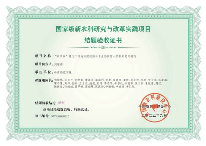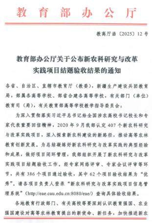 近日,教育部办公厅发布《关于公布新农科研究与改革实践项目结题验收结果的通知》(教高厅函〔202512号),20209月教育部认定407个新农科研究与改革实践项目,深入探索新农科建设的新路径,推动高等农林教育创新发展。经专家网络评审、专家会议评审等环节,共有386个项目通过验收。其中我院刘锴栋教授主持的《“新农科”理念下的地方院校园林专业协同育人机制研究与实践》项目顺利通过结题验收。