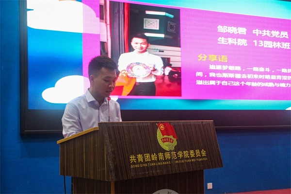 邹晓君师兄上台作事迹报告。“我默默地告诉自己一定要成为夜空中最闪亮的星。”他主要讲述自己的学霸逆袭之路上的事例,分享逆袭过程中的学习经验、以及获得的殊荣向同学们展示了他的治学之心、考研之心、工作之心和感恩之心。随后机电与工程学院的郭潭长师兄上台作事迹报告。他分享了自己在大学四年里参加比赛获得的殊荣,以及申请专利的项目,他想告诉同学们抓住锻炼自己的机会,坚持勇敢寻找适合自己的梦。同时,他用自己奋斗的经历告诉在场观众“用奋斗书写的青春一定会绽放地很精彩。”商学院的廖晏师姐用视频的方式分享她的事迹。她阐述了大学内4件比较有意义的事情。分别是好好学习、当一个学生干部、参加社会实践、多到外面走走。同时她也讲述了自己在大学四年内遗憾的事情。
