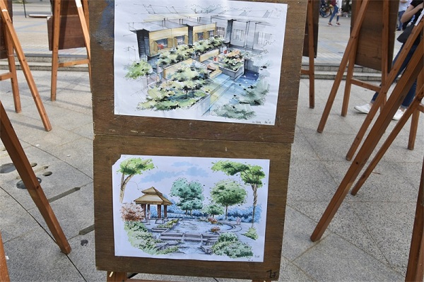 本次园林展区设有六大展区:图片画展、模型展、盆景展、插花艺术展、生活小盆栽和专业示教区。在“零基础,大进步,现本质”的图片画展中的作品均是由各专业的老师挑选出来的优秀作品,作品上一笔一线的细细的刻画,显示出园林学子作画时的用心与细致。