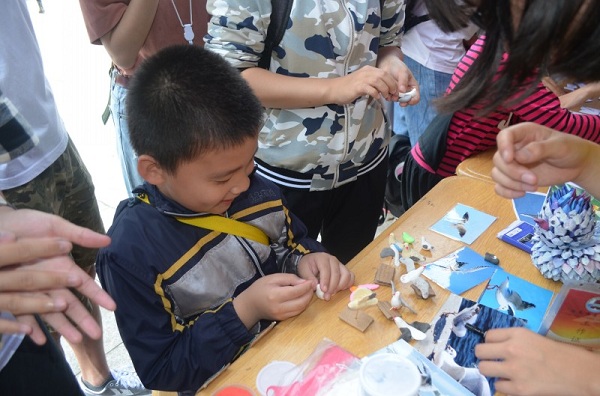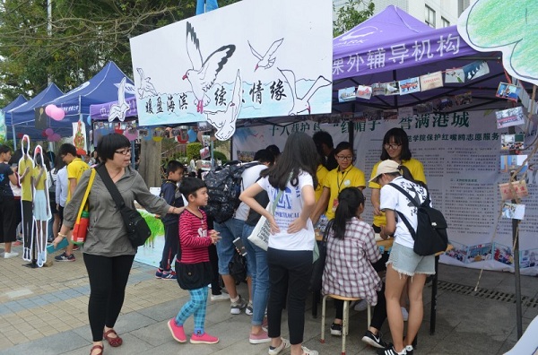 红嘴鸥展区人头攒动,展区负责人员身穿黄色志愿服装,头戴红帽子,热情地向观众解说。展区的布置也透着满满的创新与创意,比如两位学生身穿志愿服装、摆着志愿手势的影像做成的人形架,吸引了众多观众前来拍照;用电脑播放宣传保护红嘴鸥时的录像,和着歌曲,有唤醒人的善良与爱心的力量;游戏“捏红嘴鸥”中,工作人员细心教观众如何捏红嘴鸥,红嘴鸥变得形象生动起来,让观众特别是小朋友更加熟知红嘴鸥的外形特征;“知识阅览”中选择的《红帽子演绎生态梦》和《十八载护鸟“红帽子”誉满港城》将红帽子志愿者18载护鸥的正能量传递给每一位读者……