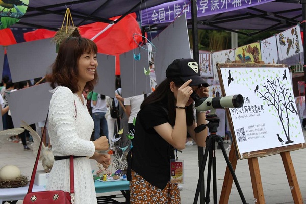 羽扬鸟社展区由体验区、游戏区和展示区组成。在体验区,同学们可以使用望远镜观察百米之外的美景细节。其间,有位观察者惊呼,“哇!我看到了百米外洋红风铃木花中飞翔的小蜜蜂!”这引得同学们纷纷来体验美妙的视野世界。