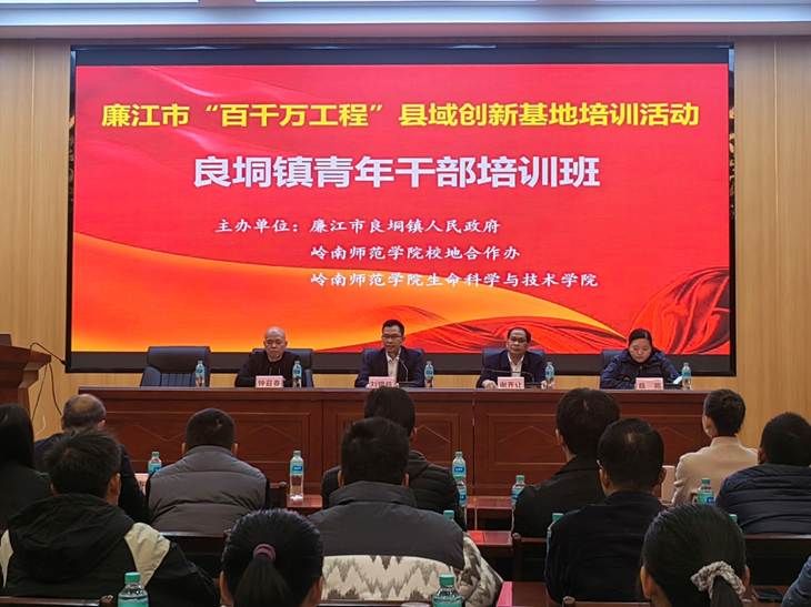 为深入推进省“双百行动”落地见效,强化校地协同育人实效,赋能基层青年干部成长成才,11月20日上午,由岭南师范学院校地合作办、生命科学与技术学院(下称“生科院”)与良垌镇人民政府联合主办的良垌镇“青年干部”培训班在中塘乡村大课堂顺利开班。岭南师范学院校长办公室副主任、省“双百行动”驻廉江服务队队长钟召春出席会议,生科院组织专业师资团队全程授课,为全镇约150名青年干部送上“能力提升大餐”,良垌镇党委副书记蔡苑主持培训,省“双百行动”驻廉江服务队队长钟召春出席培训会议。