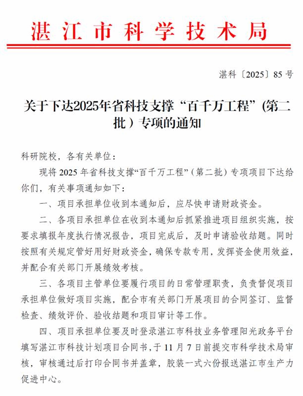 近日,湛江市科学技术局下达 2025 年省科技支撑 “百千万工程”(第二批)专项项目通知,岭南师范学院生命科学学院(以下简称 “生科院”)喜获佳绩,成功获批 3 项专项项目,涵盖科技成果转化、农村科技服务、科普调研三大领域,彰显了学院在服务地方经济社会发展、助力乡村振兴方面的坚实实力。