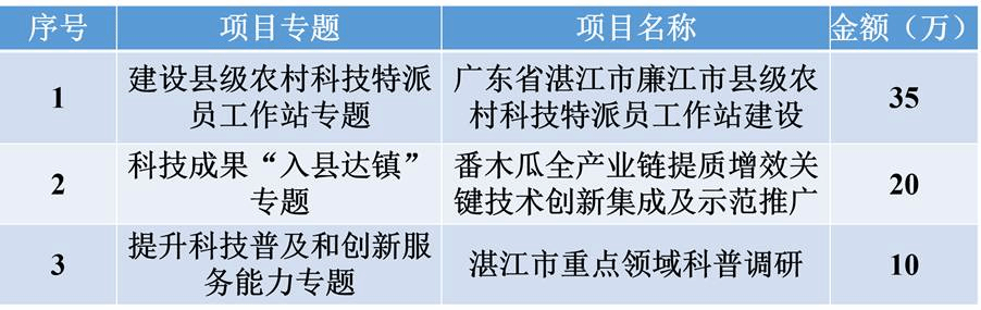 此次获批的 3 个项目中,刘锴栋教授主持两项。其中,“广东省湛江市廉江市县级农村科技特派员工作站建设” 项目入选 “建设县级农村科技特派员工作站专题”,获专项经费 35 万元。该项目将依托廉江市农业产业发展需求,搭建农村科技服务平台,通过派驻科技特派员、开展技术指导、推广先进成果等方式,打通科技服务 “最后一公里”,为当地农业提质增效、农民增收致富提供有力支撑。另一项由刘锴栋教授主持的 “湛江市重点领域科普调研” 项目,入选 “提升科技普及和创新服务能力专题”,获专项经费 10 万元,将聚焦湛江市科普工作重点领域,开展系统性调研分析,为优化科普资源配置、提升区域科普服务水平提供决策参考。