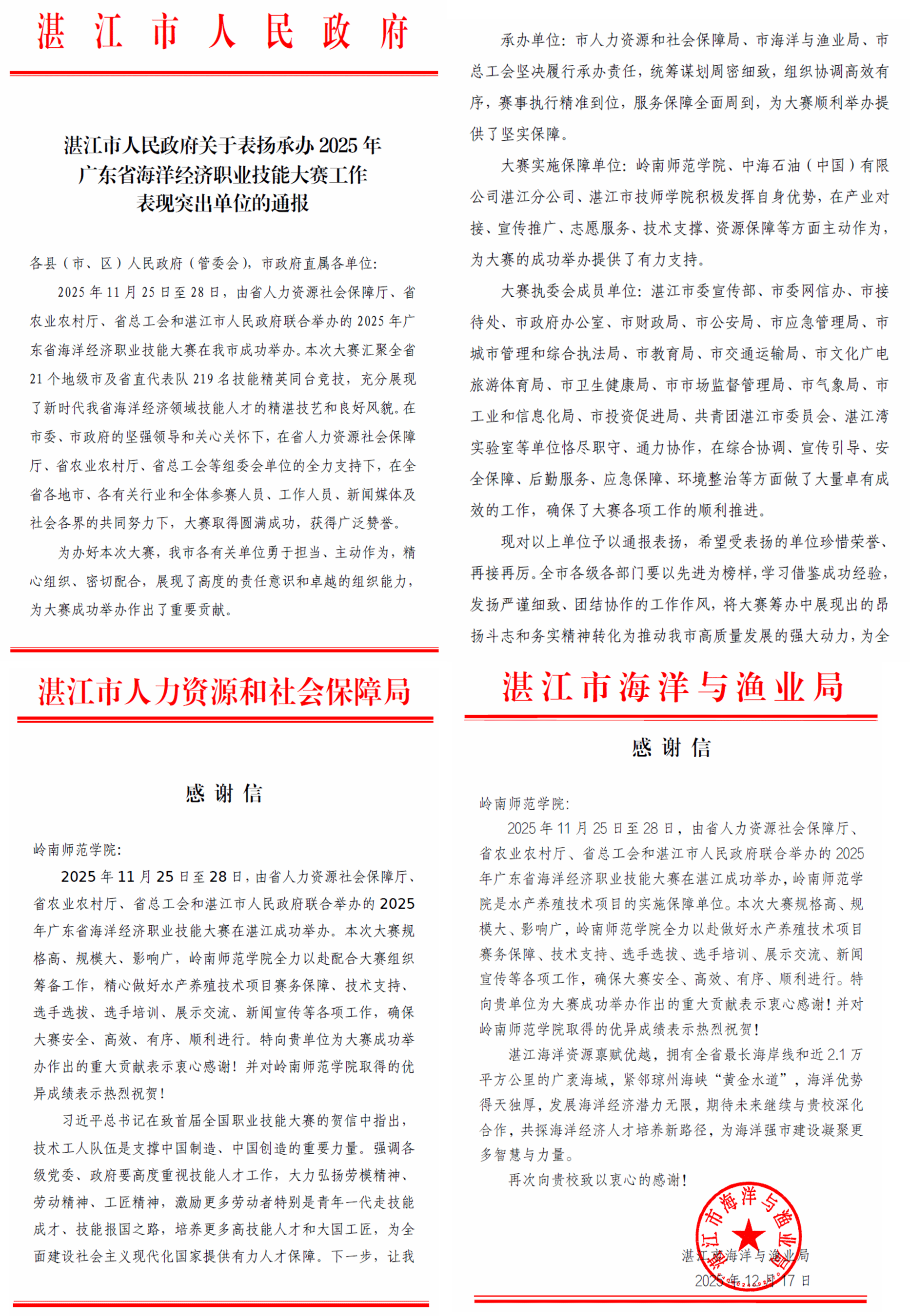近日,湛江市人民政府发布《关于表扬承办2025年广东省海洋经济职业技能大赛工作表现突出单位的通报》,我校作为大赛实施保障单位,因在赛事筹办及举办过程中的突出表现获官方通报表扬。此外,大赛承办单位湛江市人力资源和社会保障局、湛江市海洋与渔业局也发来感谢信,向我校为大赛成功举办做出的重大贡献表示衷心感谢。
