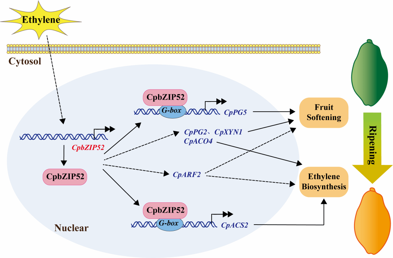 CpbZIP52调控番木瓜果实成熟的作用机制模式图
