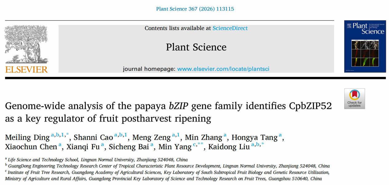 近日,生科院2025级生物与医药专业硕士研究生曾梦、汤红雅分别以共同第一作者、参与作者在国际知名期刊《Plant Science》(IF:4.1)上发表题为“Genome-wide analysis of the papaya bZIP gene family identifies CpbZIP52 as a key regulator of fruit postharvest ripening”的研究文章,为番木瓜果实采后保鲜与品质改良提供了重要的理论依据与分子靶标。