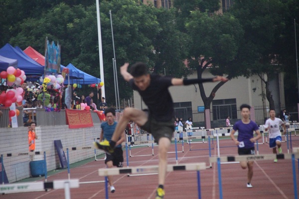 来自17生技班的林青威同学在枪响之后迅速冲出,在第五跑道的他以迅雷不及掩耳之速赶超了在他前面的运动员,赛道上只留下他帅气的黑衣背影。在还剩最后几个栏杆时他不幸摔倒在地面上,就在大家都握紧拳头为他着急的时候,只见他马上站起来继续向前冲去。他坚持到底,奋力跨过剩余栏杆的毅力让现场观众由衷感到敬佩。