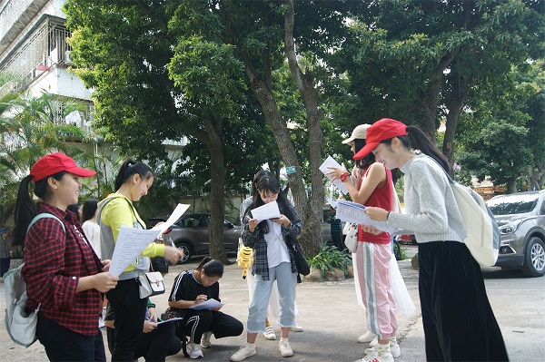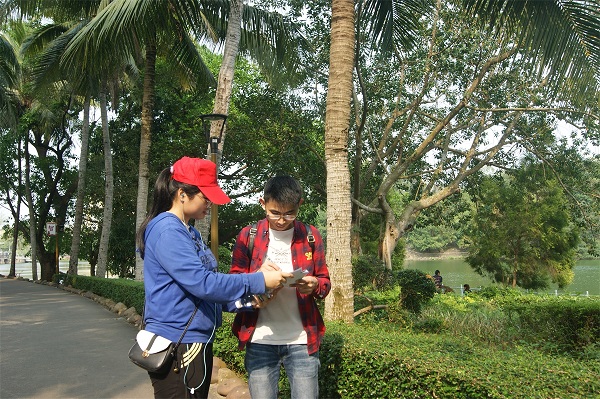 志愿者们分工合作。负责调查的志愿者向游客们认真宣传并派发关于生态文明的调查问卷。游客们对生态文明的发展十分感兴趣,都很热情地填写问卷。志愿者们也向游客们派发了相关的宣传单和展示了“变废为宝”的模型照片,以鼓励他们积极对可循环利用的生活用品进行二次利用和引起其“变废为宝”的兴趣。