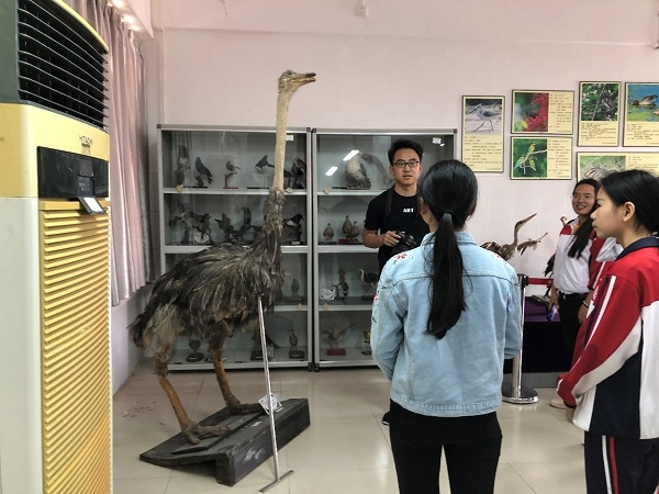 湛江市中医学校师生们了解安全事项后,在讲解员们带领下分别参观了昆虫标本室、鸟类标本室和兽类标本室。在博物馆里,中医学校的师生了解了昆虫的发育过程和动物的形态结构的特征,并且在兽类馆中对鸵鸟和孔雀等动物标本进行了深入的探讨学习。讲解员在讲解鸟类的过程中特别强调了湛江当地有名的保护动物——红嘴鸥,呼吁大家共同保护红嘴鸥。