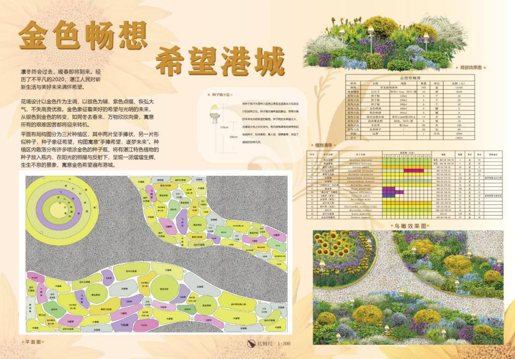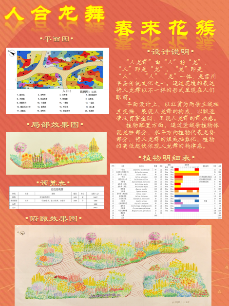 此次比赛我院园林专业入选的两个方案中,一个名为“金色畅想、希望港城”:是以金色为主色调,以紫色为对比色,并加入金色种子瓶小品,展示湛江常见乡土植物的种子,增加科普效应,同时寓意着金色的希望。另一个名为“人合龙舞,春来花簇”:是以湛江非遗舞蹈“人龙舞”为主要表现内容,通过红色、黄色的花带交织起伏,象征着舞龙的腾挪起伏之势,并以地面人字铺装进一步点明主题,彰显了浓郁的地域文化。显示了我院园林专业学生过硬的园林设计和施工能力。