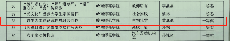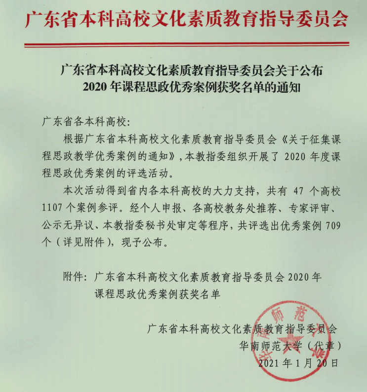 此外,广东省本科高校文化素质教育指导委员会发布了《关于公布2020年课程思政优秀案例获奖名单的通知》,我院黄真池副教授提交的生物化学课程案例——《以生为本建设课程思政共同体》获得省课程思政优秀案例评选一等奖。
