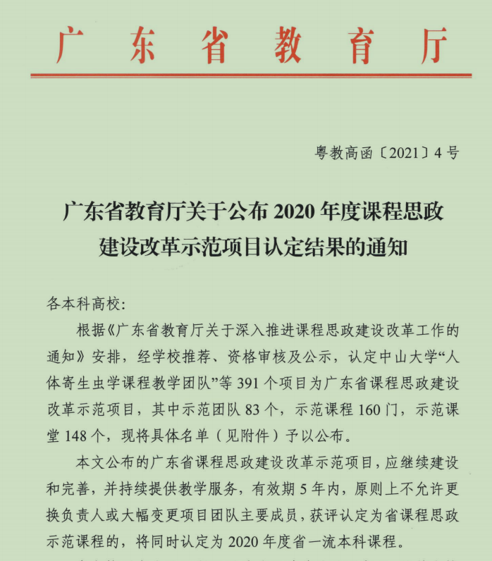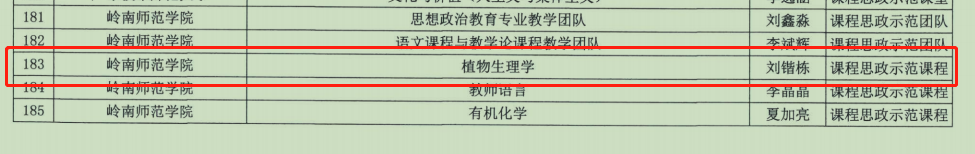 日前,在广东省教育厅发布的《关于公布2020度课程思政建设建设改革示范项目认定结果的通知》(粤教高函【20214号)中,我院刘锴栋教授、刘晚苟教授等作为课程主要成员开设的《植物生理学》课程获认定为2020年广东省课程思政示范课程。