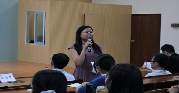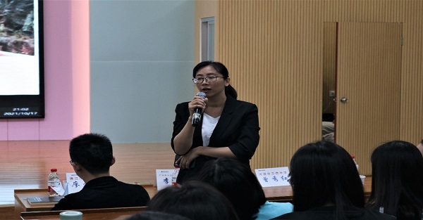 广东省清远市清新区第二中学教师张迪首先做了自我介绍,接着她给同学们介绍生物科学(师范)专业的就业方向,并给同学们分析考研的就业优势,她认为考研能提升自我,提高学历的同时,还能提高自身的科研能力和教学能力。