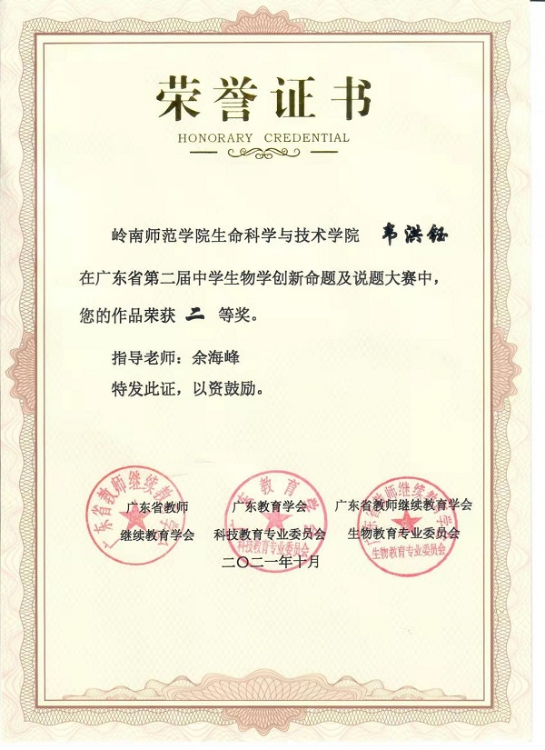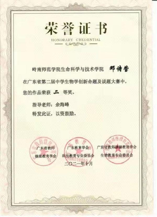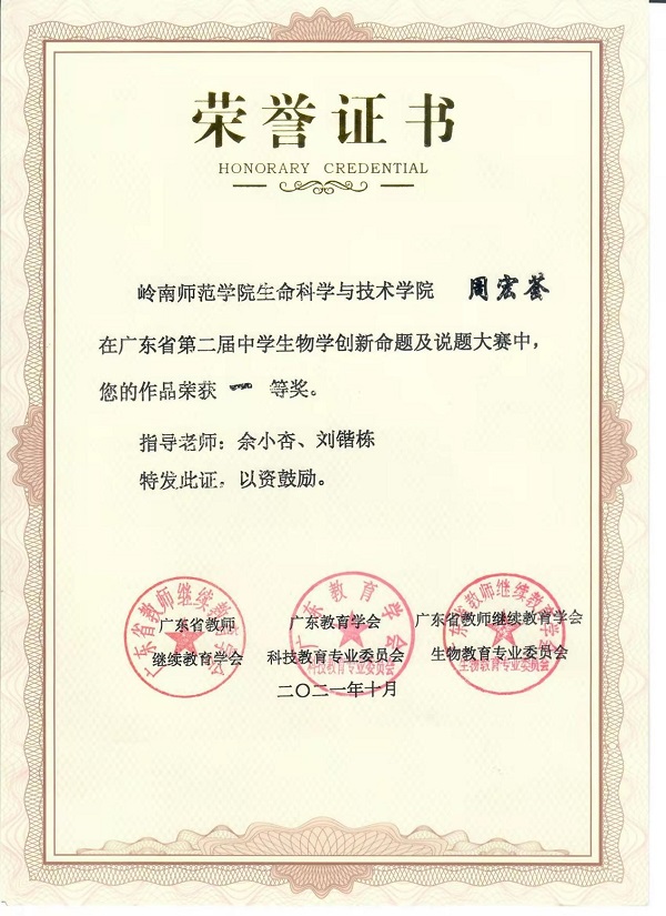 此大赛由广东省教师继续教育学会、广东教育学会科技教育专业委员和广东省教师继续教育学会生物教育专业委员会联合举办。为促进生物科学专业师范生专业素养和命题能力的提升,生科院组织学生参与广东省第二届中学生物学创新命题及说题大赛,比赛内容以贯穿新课标理念、新课标课程内容、新课标教学方式和实践为主线。此比赛共收到作品207份,(高中组131份,初中组76份),其中共有13份作品来自于在读大学生,194份作品来自中学教师,在校大学生与一线教师同台pk命题能力。