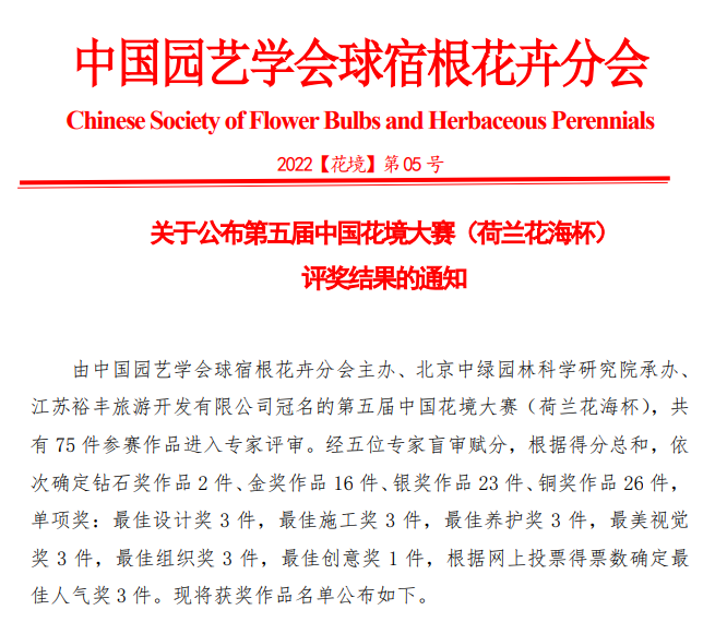 中国花境大赛由中国园艺学会球宿根花卉分会主办,是我国花境领域最系统、最权威的全国性大赛,也是报奖过程最漫长、赛制最严谨科学的大赛。(需要提供完整的设计资料、分阶段提供四个季节的实景照片、养护台账、终审材料等13类材料)。报奖过程长达一年之久,可谓花境比赛类的“马拉松赛”。对作品的设计、施工、养护等各个环节都有严格的要求。此次大赛共有75件来自全国各地的参赛作品进入最终的专家评审阶段。经五位专家盲审赋分,最终得出成绩排名。