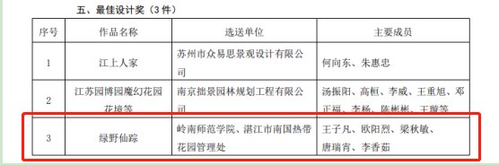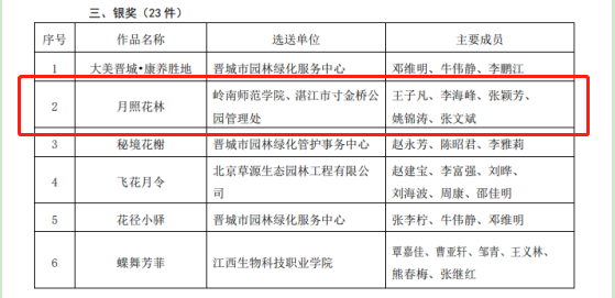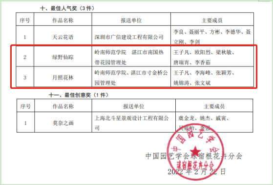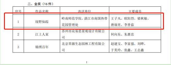 我院王子凡老师近年来一直在花境领域积极进行探索实践,带领学生与湛江各大公园合作,营建了一系列适合华南地区气候的花境。此次选送参赛的两个作品分别位于湛江南国热带花园(“绿野仙踪”)和滨湖公园(“月照花林”)。这是我院师生将理论与实践相结合,第一课堂与第二课堂相结合的良好案例。作品能够获得全国性大奖,说明了我院师生在园林专业领域的实力,也彰显了服务地方的能力。