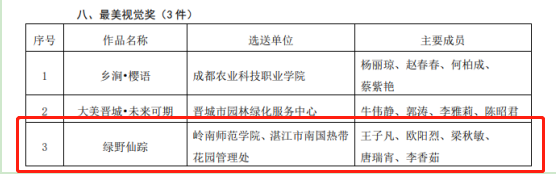 这是我校唯一的一个农学专业——园林专业人才培养成果的体现,2020年园林专业获批教育部首批“新农科”研究与改革实践项目,2021年园林专业获批广东省“特色专业”立项建设。此次获奖充分体现了园林专业近年来的教学改革成果。