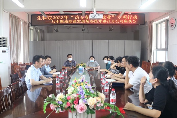 为深入开展访企拓岗促就业专项行动,开拓更多就业岗位和机会,推进毕业生更充分、更高质量就业,6月10日,生科院与中海油能源发展装备技术湛江分公司在燕雷楼D-505开展合作交流座谈会。生科院副院长(主持工作)刘锴栋、党委副书记覃静君、副院长孙余、生物技术相关老师以及中海油能源发展装备技术湛江分公司技术中心经理李春祥、技术中心主任工程师王英、项目工程师张海鹏。