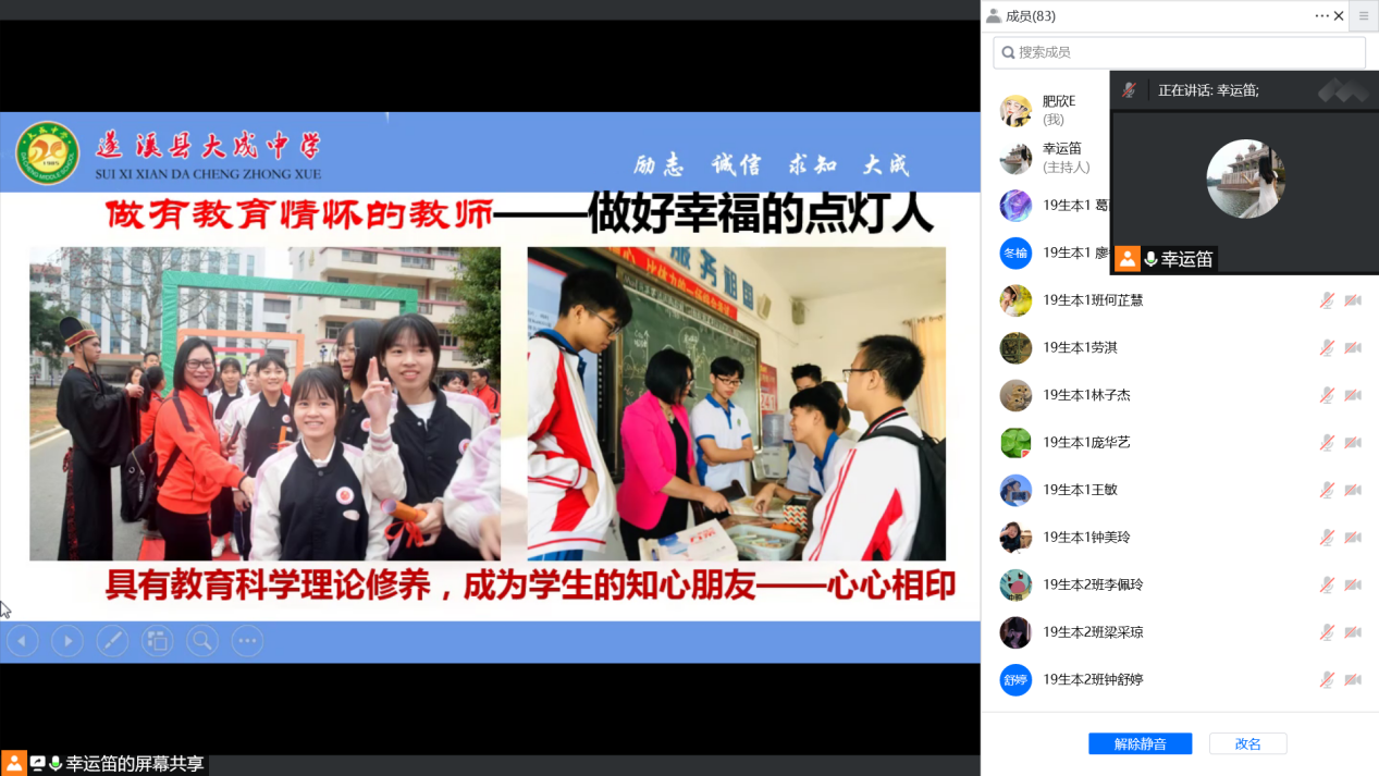 其次罗碧梅向生科院的学子们展示了她在教学路上的众多成果,正如她所说的那样:在教学中研究,在研究中提高教学。时刻保持学习状态,做与时俱进的教师。她曾参加过2012年湛江市骨干教师培训、2015年课程改革培训、2015年湛江市名教师培训、2016年省级骨干教师跟岗培训、2018年广东省李遂梅名教师工作室学习、2018年到香港孔教学院大成何郭佩珍中学学习活动、2019年省级骨干教师送教下乡、2019年指导生科院师范生教育实习等学习交流活动。她从“做好幸福的点灯人——打铁还需自身硬”、做有教育情怀的老师等角度展开讲座,以此勉励在读大学生做好教师的本职工作的重要性,提醒学生需不断提升自己,增强自身的竞争力。