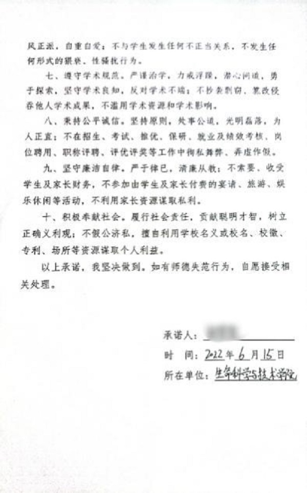在会议举行前,全院教职工共同签订《岭南师范学院师德师风承诺书》。会议上,刘锴栋副院长(主持工作)结合全国高校近期发生的个别教师违反师德师风典型案例,以案说法,引导教育大家争取做一名师德高尚的教育工作者。他希望全体教师要以教师职业道德规范严格约束自己,在工作中做到廉洁从教,保持廉洁自律,坚持高尚情操,抵制不良风气,保持教育公正。
