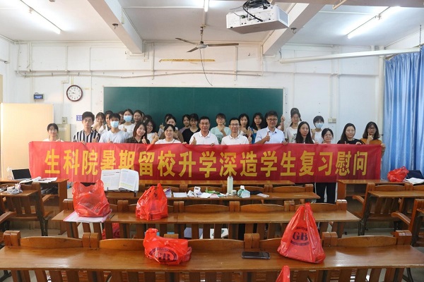 为坚定升学深造学生的信心,给学生以关怀和鼓劲,生科院党委书记李发武、院长刘锴栋、党委副书记覃静君、副院长王锂韫、副院长孙余丹于7月24日上午在教三502、503深造自习室慰问参加2023年硕士研究生考试的19级学生,并送上“升学深造加油包”,为同学们助力加油。