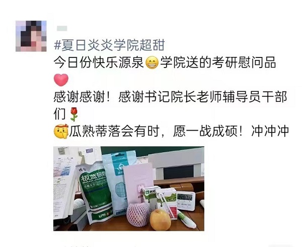 最后,学院班子成员将精心准备的牛奶,水果,文具,防暑饮料和口罩等考研慰问品分发给学生,表达学院的关怀。同学们倍感温暖,也更加坚定了他们拼搏奋斗的决心,他们纷纷表示一定会坚定升学深造信念,保持学习动力,刻苦努力,争创佳绩,为学院争光,为学校添彩。