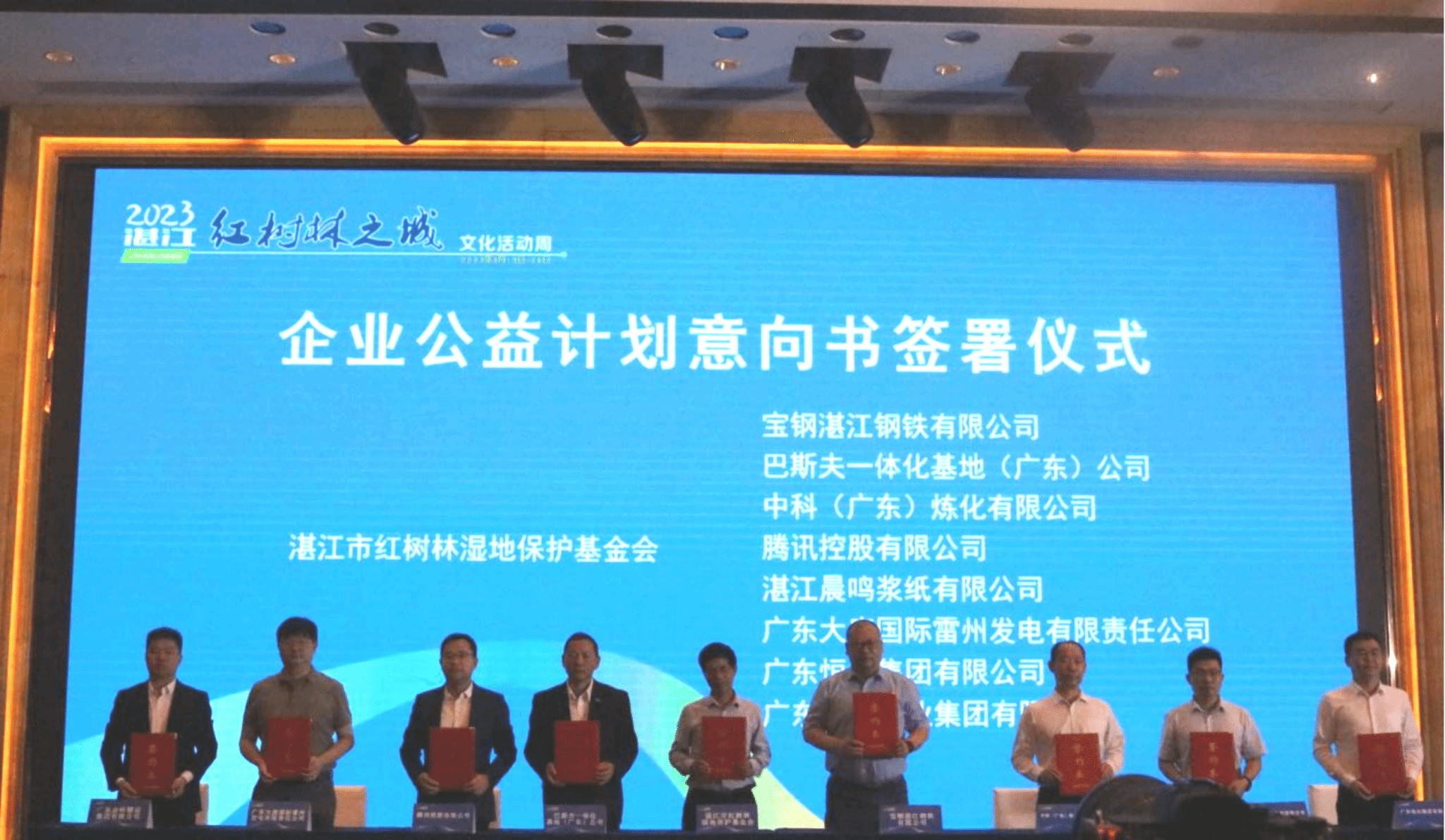 湛江市红树林湿地保护基金会与宝钢、巴斯夫、中科炼化、腾讯公益等多个企业代表完成企业公益计划意向书签署。