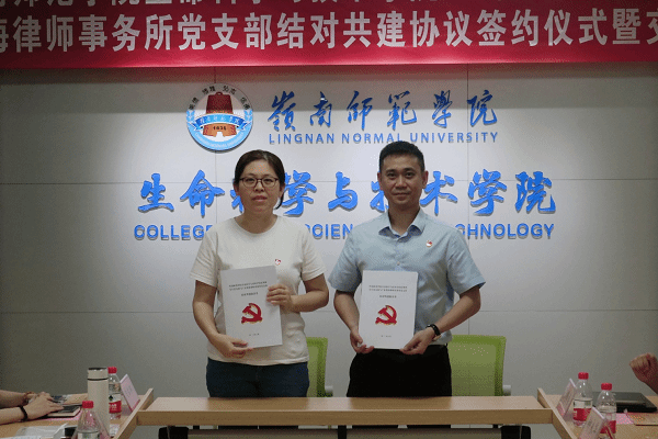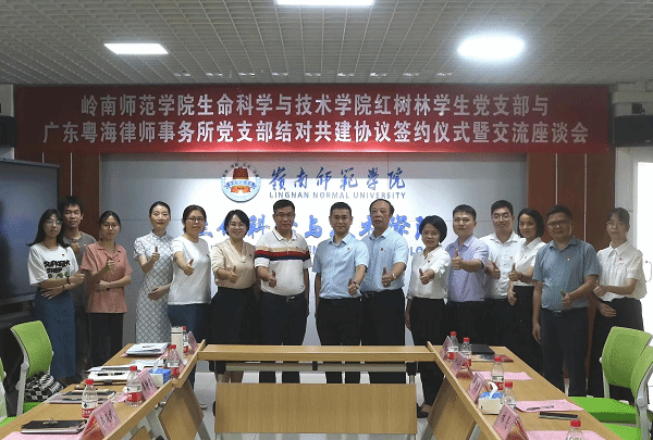 为贯彻落实党的二十大精神,学习贯彻习近平新时代中国特色社会主义思想主题教育,夯实党建基础,激发党建活力,2023年6月8日下午,生科院“红树林”学生党支部与广东粤海律师事务所在生科院学术报告厅举行交流座谈暨共建签约仪式。生科院党委书记李发武、副书记覃静君、生科院“红树林”学生党支部书记李永芹、党建联络员潘晓艳和支部学生党员代表,广东粤海律师事务所党支部书记林亮、副书记冯飞雪,宣传委员张炎丽,党员律师钟永华,颜宏宇,陈鹏禧,黄智等人参加会议。