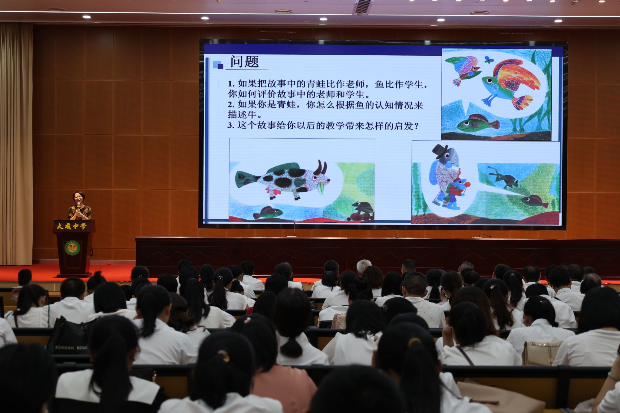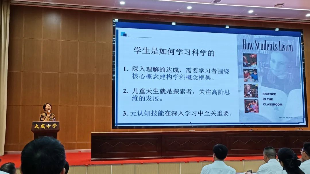 文静老师借用有趣且有启示意义的鱼牛故事,展开了讲座内容,让大成中学的老师们从小故事中产生了更多对课堂教学改革的启发和深入思考:①深入理解的达成,需要学习者围绕核心概念建构学科概念框架;②儿童天生就是探索者,应当关注学生高阶思维的发展;③元认知技能在深入学习中至关重要。