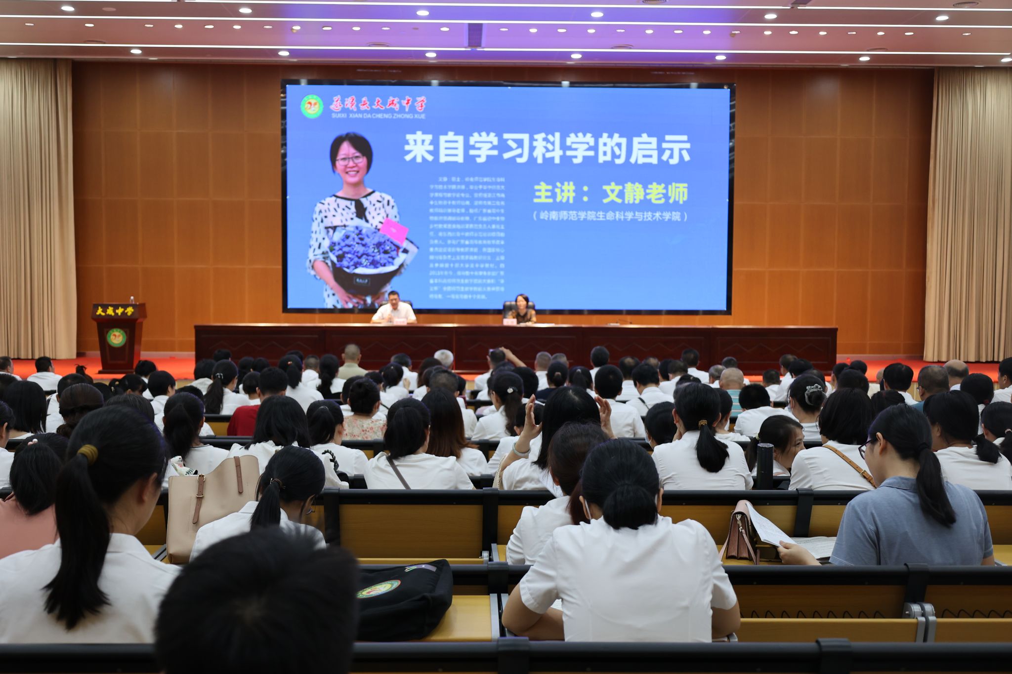 为贯彻落实好《广东省推动基础教育高质量发展行动方案》(粤府[2021]55号)和《岭南师范学院赋能基础教育高质量发展行动方案》,促进基础教育高质量发展,同时落实广东省校本研修示范培育学校的相关工作,6月19日下午,生科院生物科学系文静老师到遂溪县大成中学开展《来自学习科学的启示》的专题讲座。