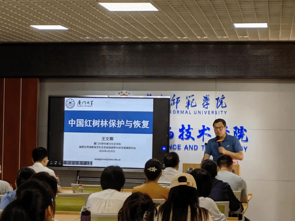 6月29日上午,由生命科学与技术学院和红树林研究院主办,科研处协办的“雷阳大讲坛”(第591期)于第四教学楼E栋507举行。中国红树林知名专家,厦门大学环境与生态学院王文卿教授作了主题为“中国红树林保护与恢复”的学术讲座。生科院和红树林研究院师生近60余人参加了本次讲座。