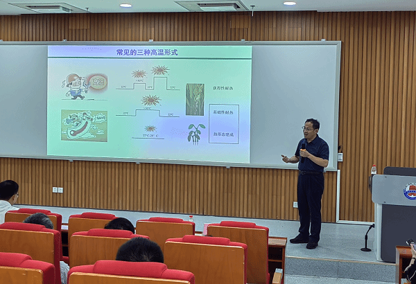 阳成伟院长主要从事植物感受环境高温的分子机制和特色植物种质创新与利用研究工作。会上,阳院长介绍了其团队针对全球气候变暖对作物的影响,围绕转录及转录后调控进行植物高温胁迫的分子机制研究。阳院长结合团队研究阐述了如何从全基因组水平、转录水平和蛋白质水平,运用分子生物学、生物化学、生物信息学和模型构建等方法探究蛋白质SUMO化调控植物高温应答的分子机理和高温损伤应答机制,目前已在模式生物拟南芥、农作物水稻、玉米以及迷迭香等特色经济植物中开展,并向与会师生分享了相关研究成果和未来展望。