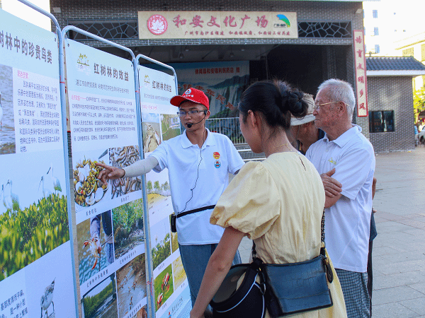 在科普宣传站,志愿者们熟练的用普通话、粤语和雷州话,对经过的群众宣传红树林科普知识,和法律保护知识,还设计了有意思的问答小游戏、抽奖等环节,现场民众都很关注,纷纷为志愿者点赞。