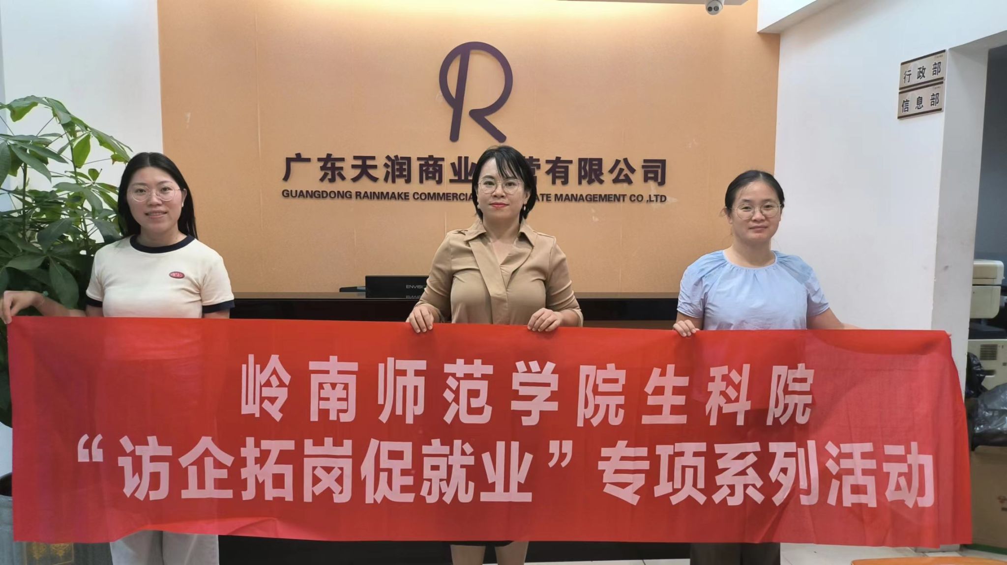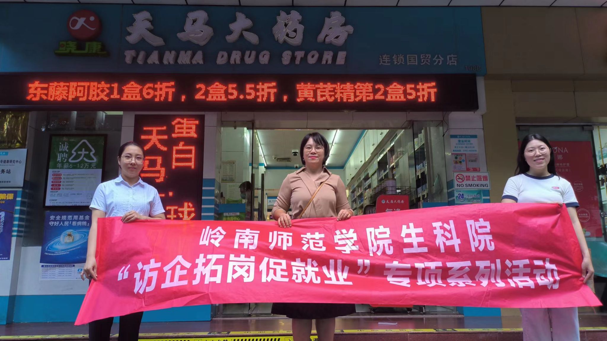 为全力促进2023届毕业生更充分更高质量就业,生科院结合专业实际多点发力促就业,通过“走出去”进一步拓宽毕业生就业渠道。7月12日,生科院党委副书记覃静君、辅导员欧斯艳到广东天润商业经营有限公司和湛江天马大药房连锁有限公司进行走访。